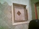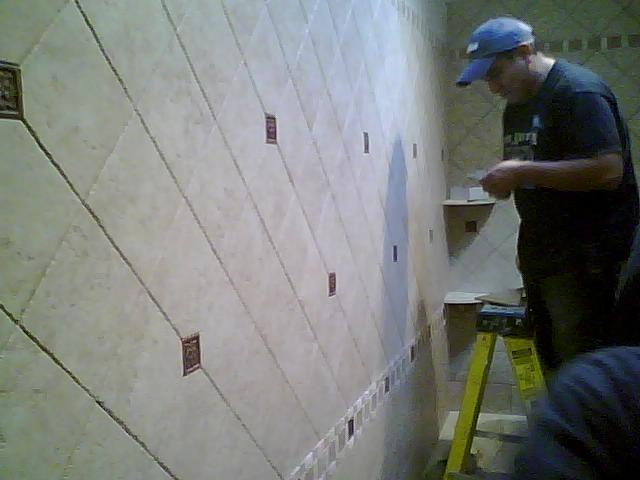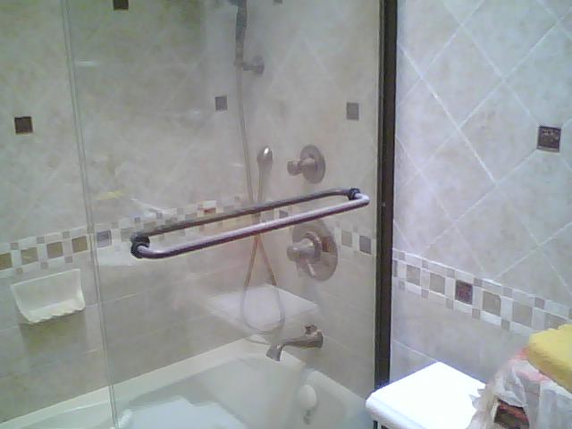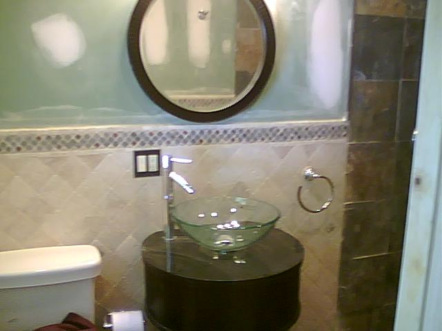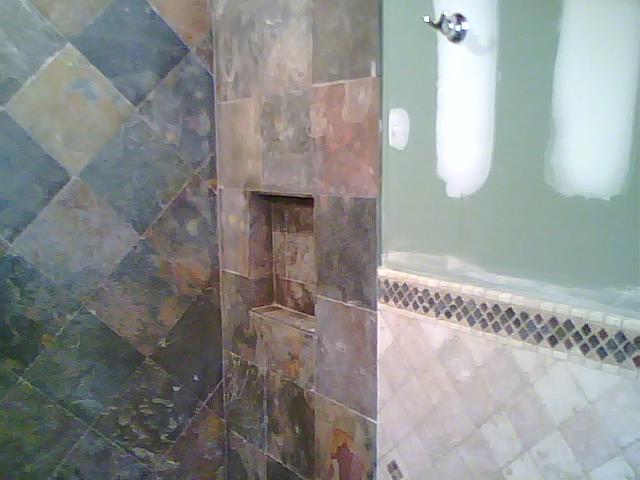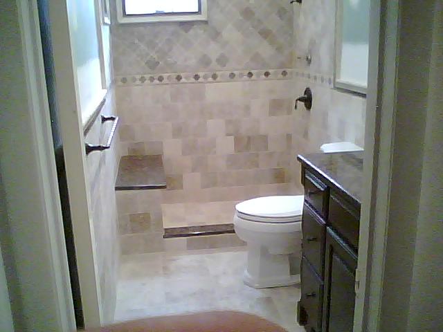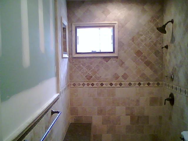 This bath room was remodel for the same customer in the above kitchen. Tiles were placed on diagonal on upper half of this custom bath room and the lower tumble stone was place in a brick pattern. We replaced the tub for a custom walk in shower with bench.