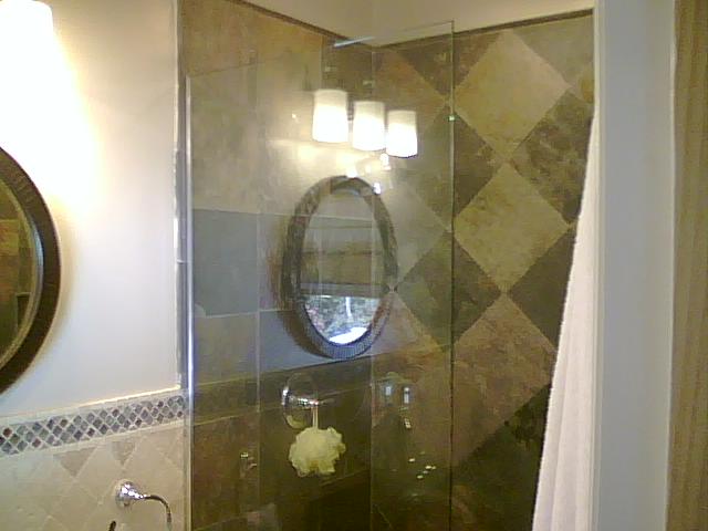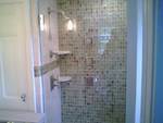 We also remodeled 4 bath rooms. 3 Full bath rooms for upstairs living area and a new half bath for kitchen/great room area. Below is the Master bath remodel with beautiful glass tile on shower accet wall. Note the 3 jet spays! This shower was converted from a tub to a custom walk in shower with bench.
