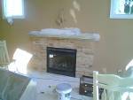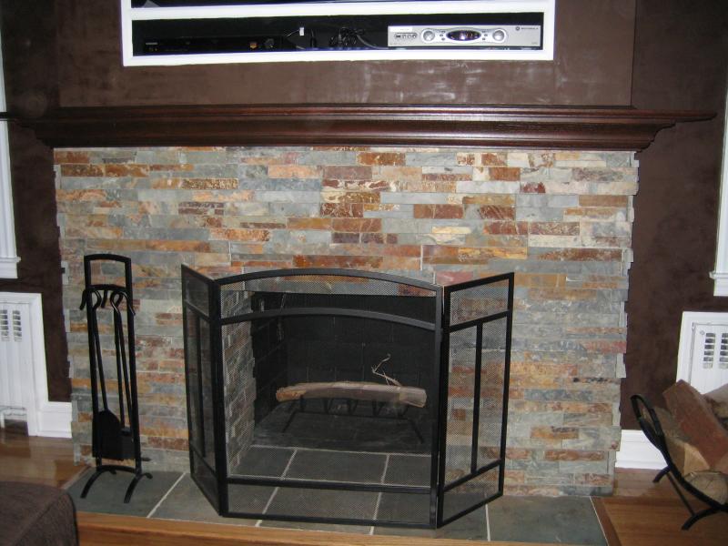 We added a beautiful custom oak mantel and stone around the fireplace and new hearth tile.