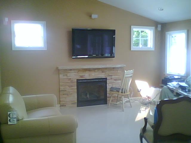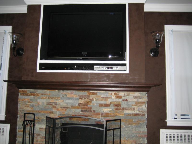 This customer wanted their fireplace remodeled after viewing an HGTV show where they built a Flat Screen recessed area above the Fireplace. We reconfigured the fireplace and built the customers dream fireplace and TV/consol area. New crown moulding around the ceiling finishes off the room!