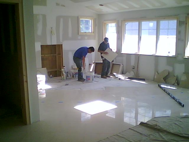 Below is the Florida room area with new large windows, new insert for new gas fireplace recessed into wall. New large porcelain tile 18x18" were laid on a diagonal.