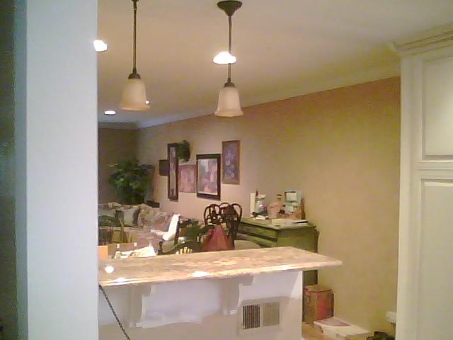 We removed an overhead dividing header to give an open look into the dining room. We added pendant lighting.